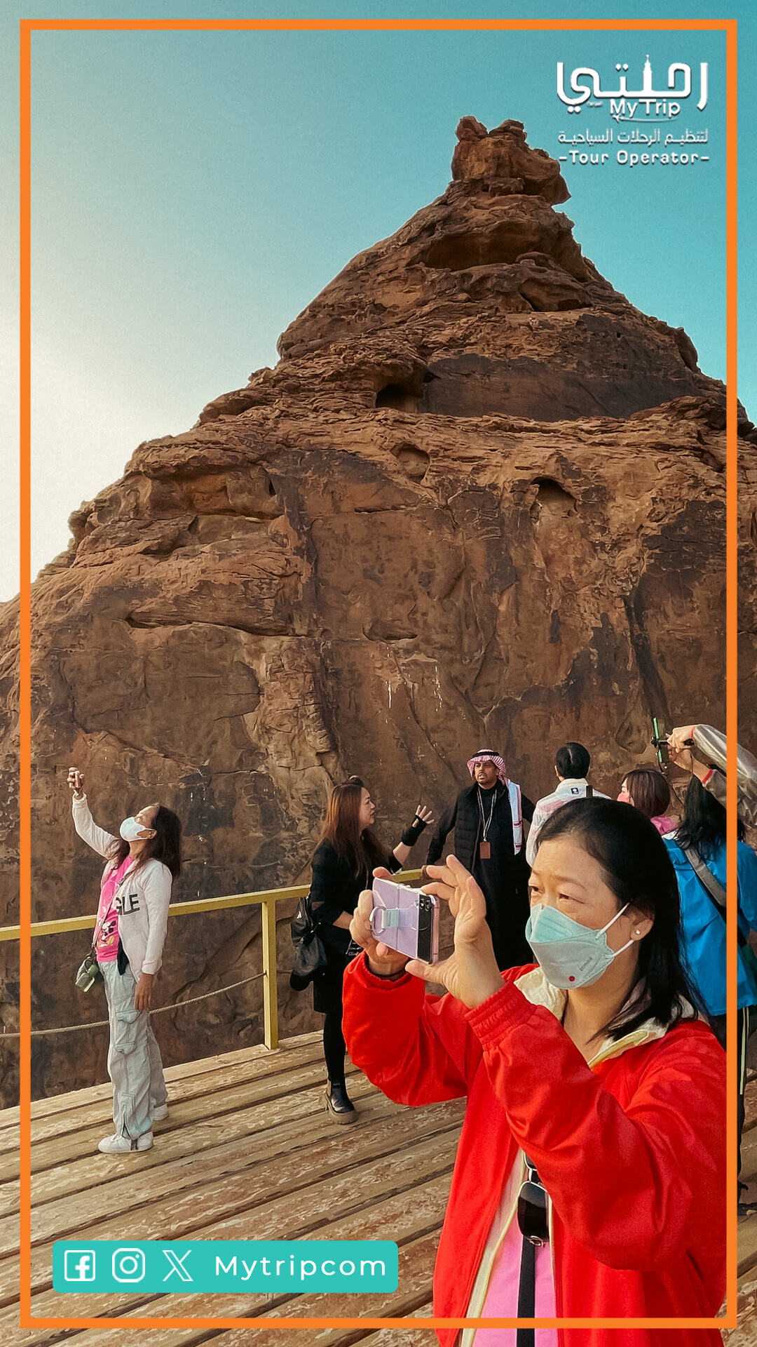 أول محطة لنا هي قاعة مرايا الشهيرة في العلا. هذه القاعة الفريدة من نوعها تعد تحفة معمارية حديثة تعكس جمال الصحراء المحيطة بها. بعد زيارتنا السريعة، نستقل وسيلة النقل الخاصة المكيفة لنبدأ رحلتنا البالغة 334 كم الى المدينة المنورة.
